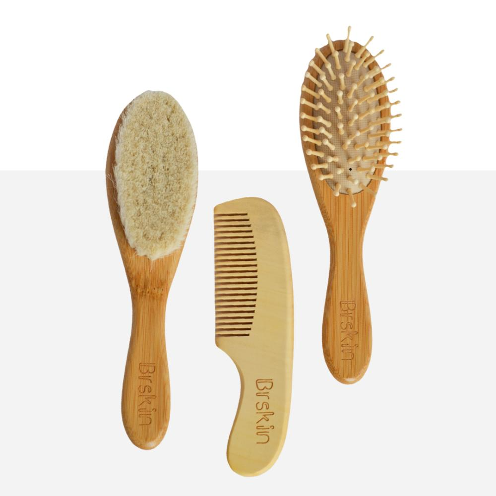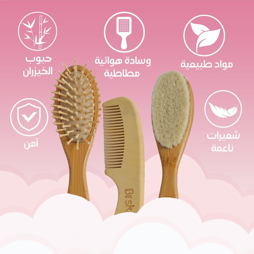 مجموعة فرشاة شعر ومشط خشبي للأطفال مكونة من 3 قطع من مواد طبيعية 100% ومضادة للحساسية✨.